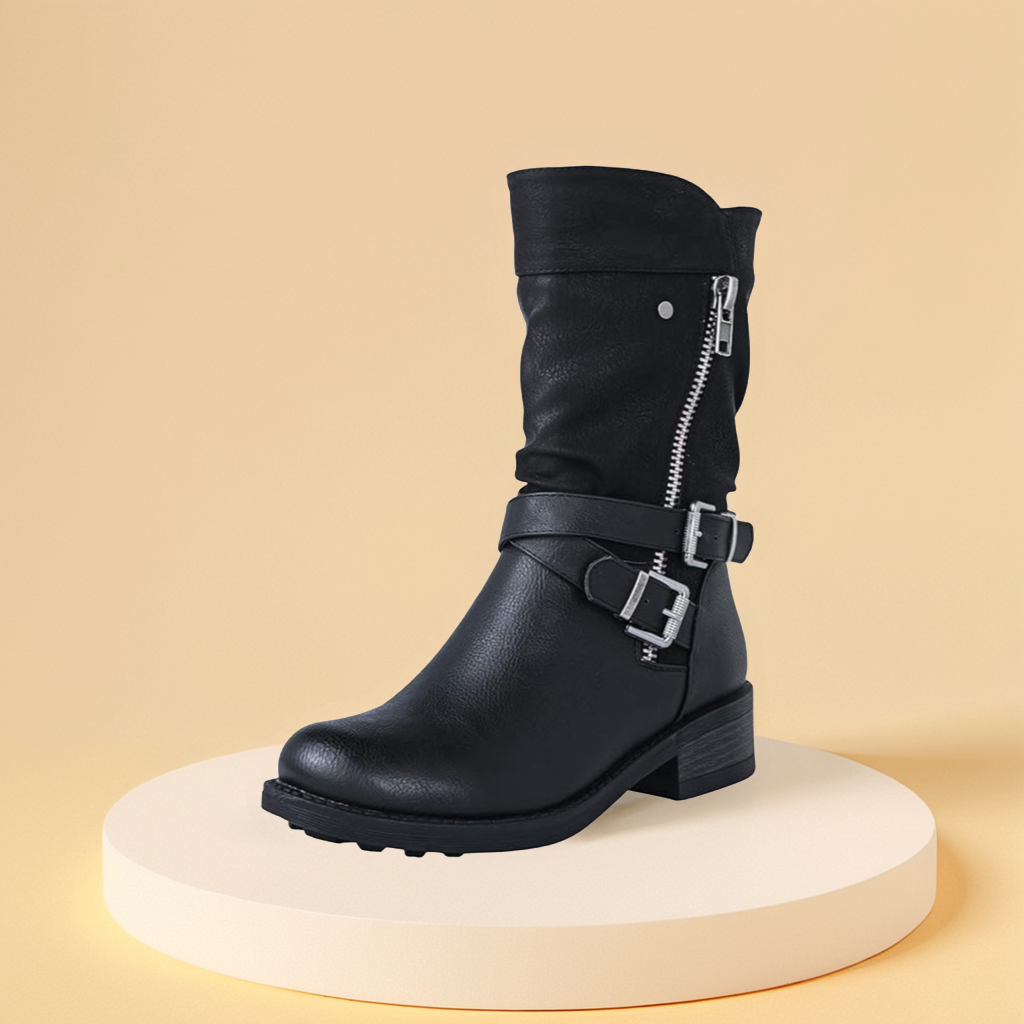 Introducing Our Chic And Versatile Mid Calf Boots For Women, Built To Infuse Your Look With An Undeniable Edge. These Dressy Fashion Boots Boast Two Sturdy Strap Buckles Around The Ankle, Reminiscent Of Classic Biker Boots Detailing, Adding A Rebellious Flair To Any Ensemble. A Decorative Zipper On The Side Enhances The Boots' Rugged Appeal, Making Them Stand Out From The Crowd. But Don't Be Fooled By Their Tough Exterior – With A Functional Zipper, These Dress Boots With Low Heels Offer Easy On-And-Off Wearability, Ensuring Convenience Without Compromising On Style. Whether You're Hitting The Open Road Or Navigating City Streets, These Biker-Inspired Mid-Calf Boots Are The Perfect Combination Of Fashion-Forward Design And Practicality, Making Them An Essential Addition To Your Wardrobe.